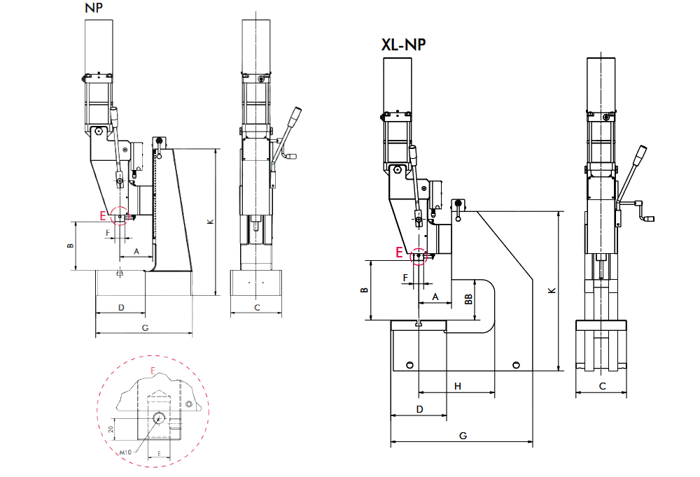 - Серия NP — базовые пневматические коленно-рычажные прессы с ручным управлением, вылет 130 мм.