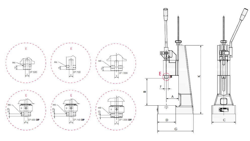 Прессы серий EP и L-EP являются ручными рычажными (кривошипно-шатунными) и используют принцип кинематического замыкания (перелома рычага). Это означает, что номинальное усилие развивается только в конце хода (в нижней мертвой точке), что идеально подходит для операций, требующих максимального усилия на коротком промежутке: штамповка, клепка, чеканка, запрессовка и т.д.