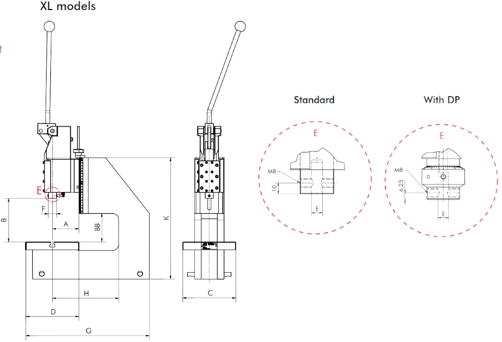 - XL-VK — серия с увеличенным вылетом (до 250 мм), специально разработанная для работы с объемными или широкими деталями, такими как печатные платы или крупный листовой металл. Конструкция — усиленная сварная станина
