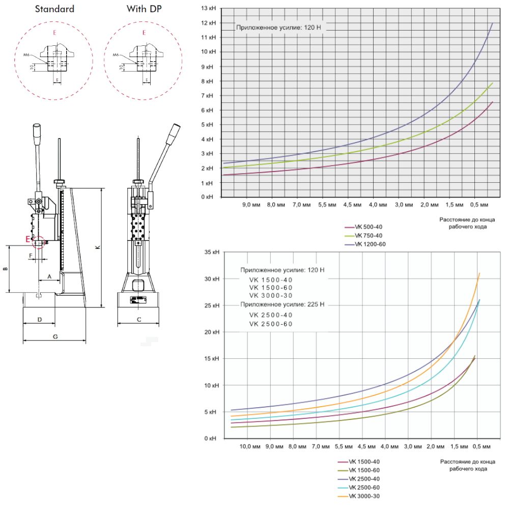 - VK — стандартная серия с квадратным плунжером для универсальных задач, требующих высокой точности и защиты от проворота инструмента. Диапазон усилий: 5-30 кН